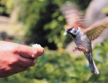 エサに釘付けのスズメ